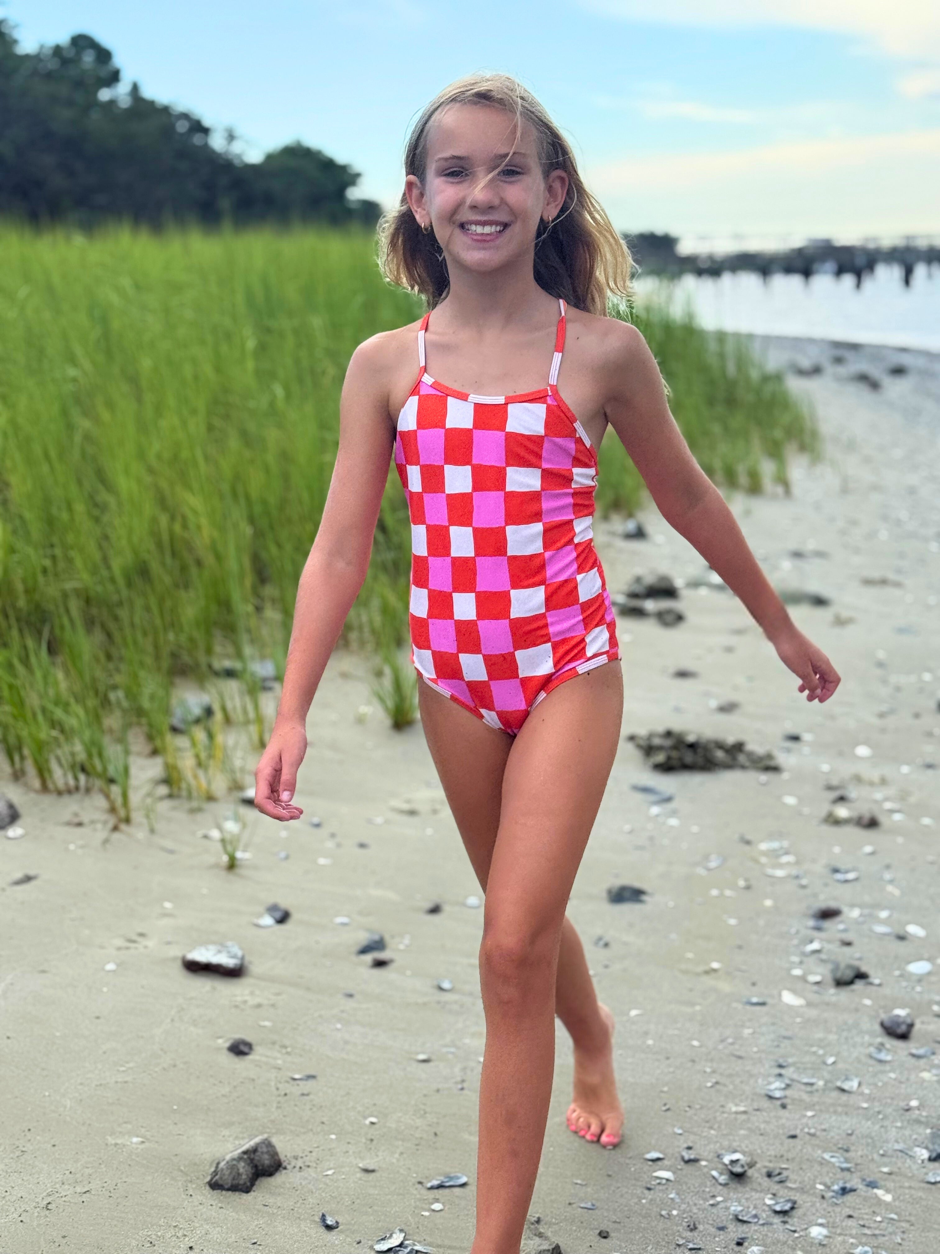 Our best selling kids one piece with "v" back straps to make it adjustable in our playful Pink & Orange Check print.