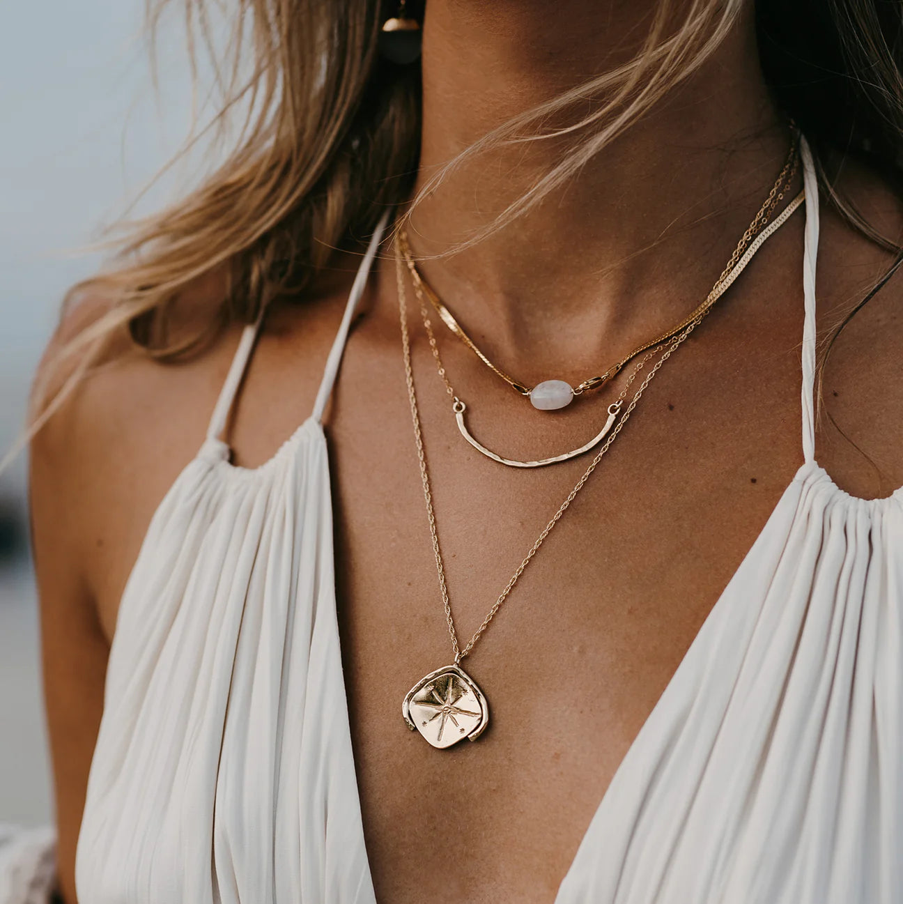 Each shell is sculpted by hand in wax, then cast and draped on a 14k gold-filled figaro chain - inspired by the vintage jewelry of the designer’s grandmother, a woman who traveled the seas.