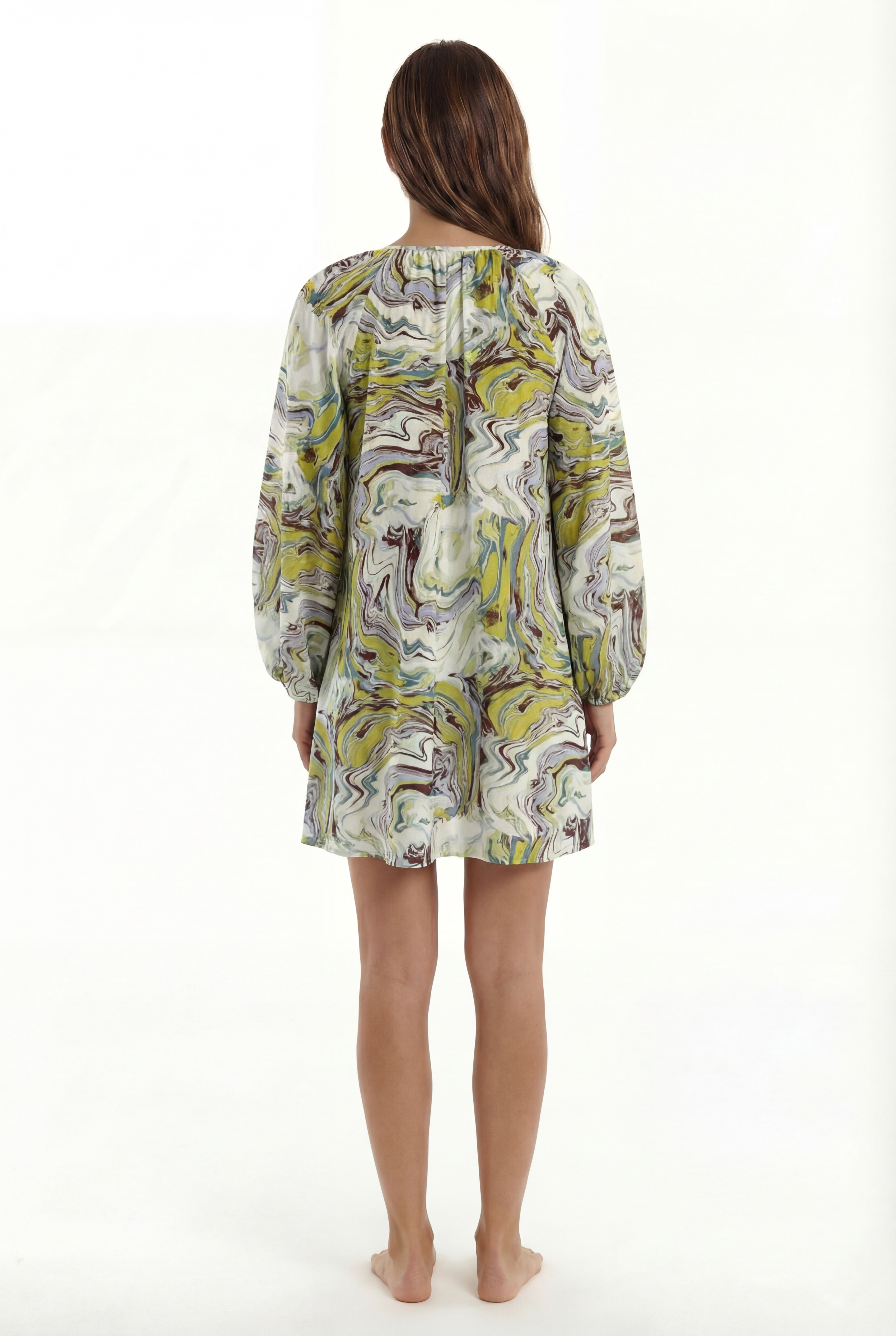 Our flowy Kate Dress featuring button detailing midway down the front in our marbled print.