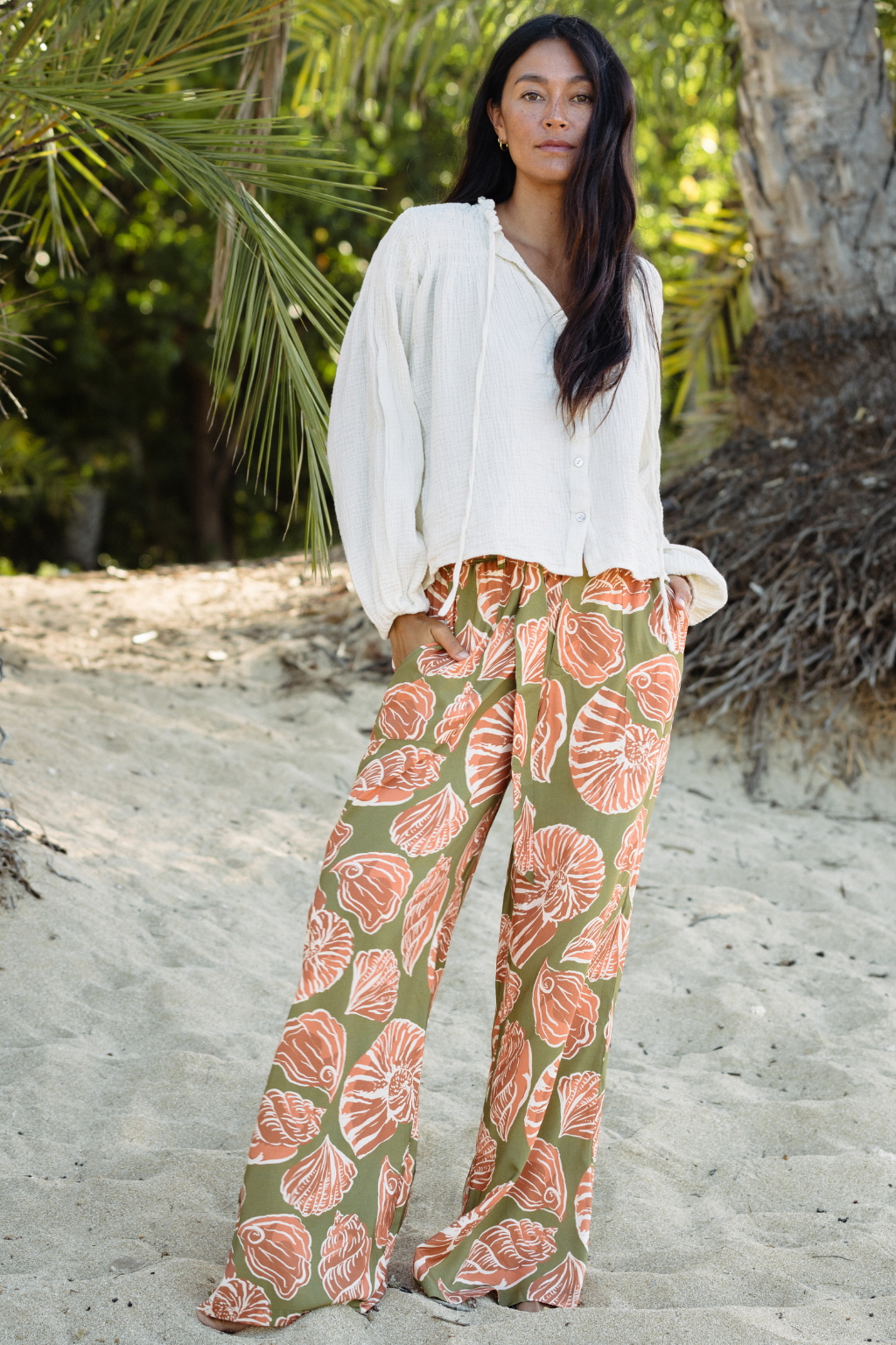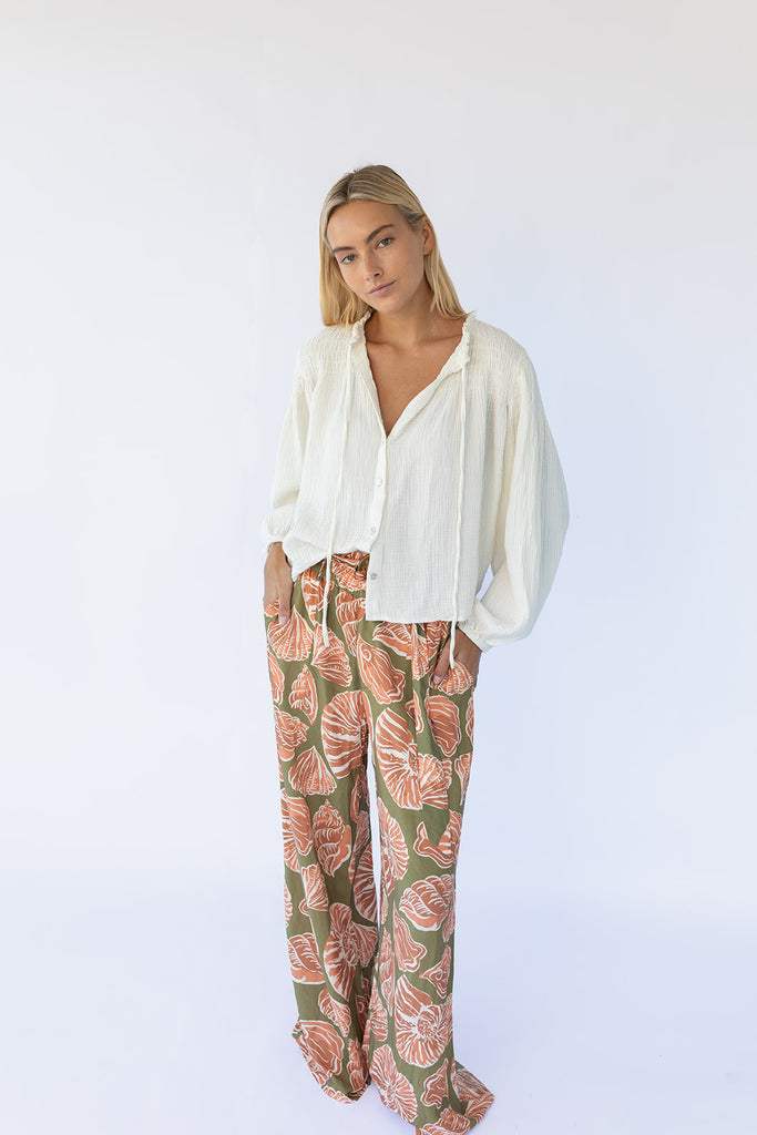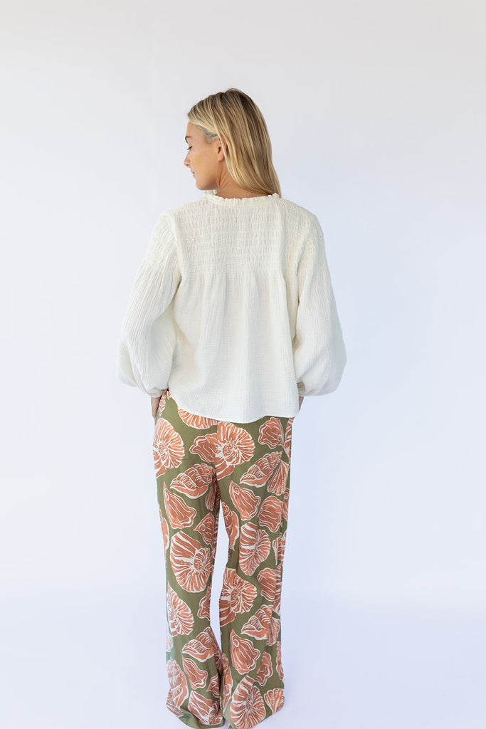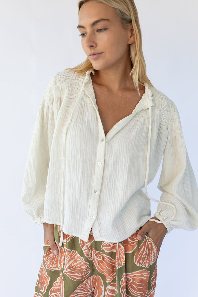 Our flowy button down blouse with unique smocking across the shoulders and back will be your go to blouse. Light and airy and perfect for every season- now in our off-white Bone gauze.