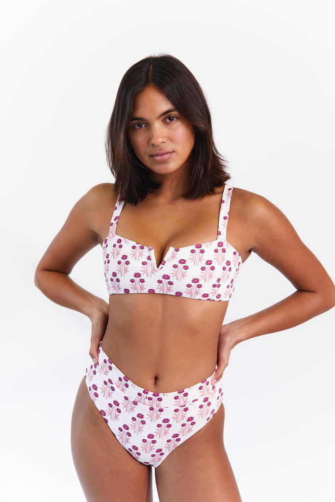 Our banded "v" front mid-rise bottom is cut high on the hip for a flattering leg lengthening look in our ultra-flattering ribbed fabric.
