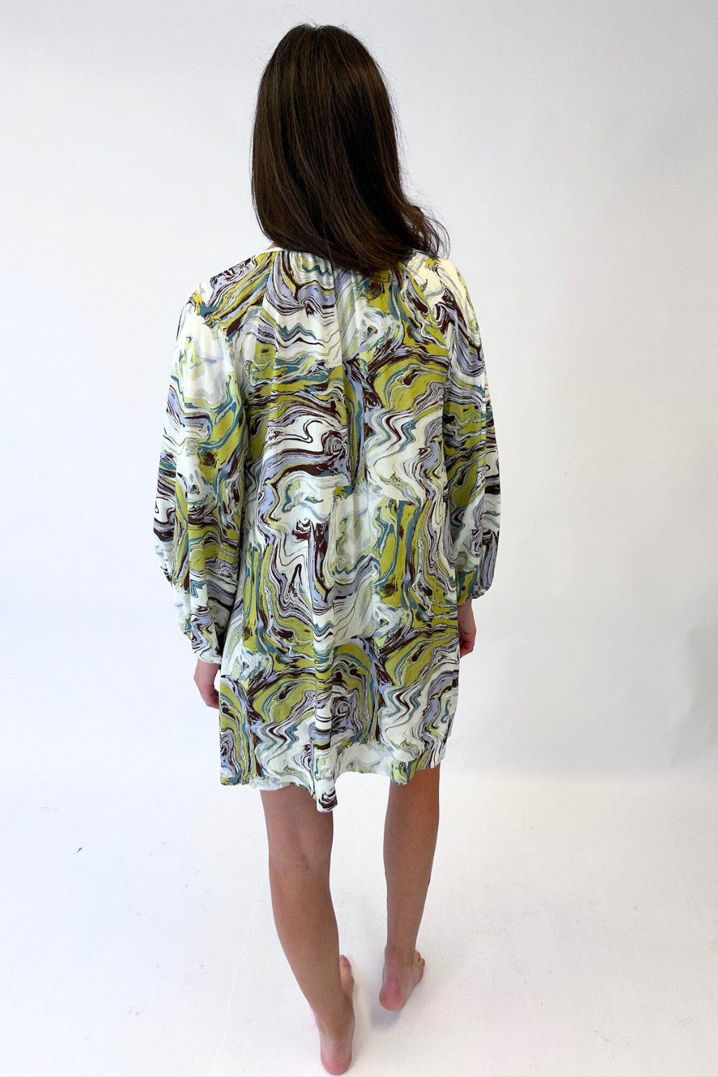 Our flowy Kate Dress featuring button detailing midway down the front in our marbled print.